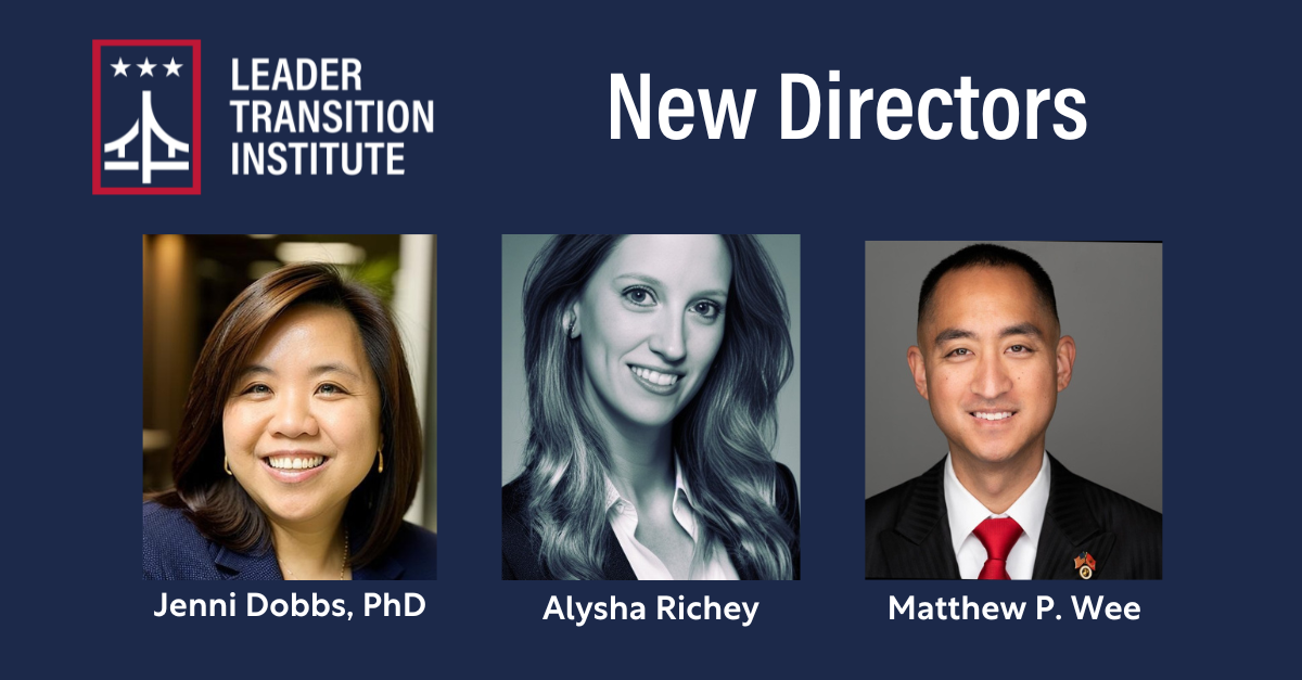 “I am thrilled to announce that the Leader Transition Institute’s Board of Directors has appointed Jenni Dobbs, PhD, Alysha Richey, and Matthew P. Wee to join us.” said Annie Brock, President and CEO of the Leader Transition Institute.